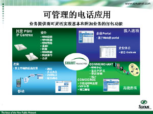 Sonus IP CENTREX解決方案主要基于可管理的語音數據綜合寬帶接入網;能夠提供話音業(yè)務的應用交換機;能夠提供桌面話音業(yè)務的IP