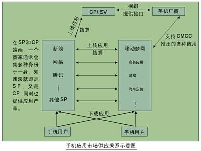 在這樣一個(gè)全新的銷售模式下,運(yùn)營(yíng)商的作用也越發(fā)凸顯出來(lái)!皦(mèng)網(wǎng)是一個(gè)大的平臺(tái),SP是個(gè)小平臺(tái),SP再通過(guò)與CP建立合作,進(jìn)而將整個(gè)應(yīng)用市場(chǎng)與終端連接起來(lái),F(xiàn)在,我們?nèi)康膽?yīng)用都放到夢(mèng)網(wǎng)上面了!北本﹫(bào)童電子商務(wù)公司的一個(gè)工作人員說(shuō)。移動(dòng)夢(mèng)網(wǎng)的建立,事實(shí)上在手機(jī)廠商、應(yīng)用開(kāi)發(fā)商、用戶三者之間搭了一個(gè)橋梁,將各種手機(jī)應(yīng)用集中在一個(gè)門戶網(wǎng)站,用戶需要時(shí),只需登陸到夢(mèng)網(wǎng)上面,點(diǎn)擊相關(guān)的網(wǎng)頁(yè),就可隨時(shí)下載所需要的應(yīng)用。