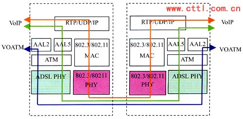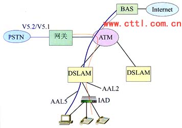 VoATM over DSL是基于ATM技術提供話音業(yè)務,話音業(yè)務和數據業(yè)務分別通過AAL2和AAL5進行封裝。AAL2技術是專為在ATM網絡上傳輸語音而設計的,在分組語音數據的封裝處理、多個分組語音數據如何在一條VC上傳送等有著嚴格的定義,它不需要為IAD配置IP地址。因此,VoATM是一種在ATM數據網上提供語音的解決方案,語音業(yè)務必須在AAL2信元中傳輸,只能應用于ATM網絡,不能應用于以IP網絡為主的數據網。