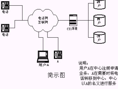 該業(yè)務(wù)方法涉及一種用戶電話轉(zhuǎn)移到CTI(Computer Telephony Integration)語音服務(wù)系統(tǒng)的接續(xù)服務(wù)方法,其CTI系統(tǒng)通過接口連接于公用電話網(wǎng),用戶在CTI系統(tǒng)登記,選擇服務(wù)功能,相關(guān)信息存入數(shù)據(jù)庫,用戶電話設(shè)置轉(zhuǎn)移;當(dāng)客戶呼叫已轉(zhuǎn)移用戶電話時,自動接入CTI語音系統(tǒng),請求相關(guān)信息,對信息進(jìn)行分析判斷、處理,查詢數(shù)據(jù)庫用戶信息,以用戶名義進(jìn)行接續(xù)服務(wù)。其完全避免了傳統(tǒng)CTI系統(tǒng)的專用特服號碼服務(wù)的弊端,充分利用了交換機(jī)的功能,以用戶的電話號碼為客戶提供語音、傳真、數(shù)據(jù)及人工接續(xù)服務(wù)。