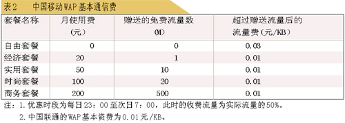 1X的優(yōu)勢(shì)是技術(shù)先進(jìn),速度快,但部分地區(qū)網(wǎng)絡(luò)覆蓋不足,開(kāi)通國(guó)際漫游數(shù)據(jù)業(yè)務(wù)的國(guó)家少。此外,在收費(fèi)上雙方也有不同。表2是中國(guó)移動(dòng)與中國(guó)聯(lián)通WAP基本通信費(fèi)比較(各省之間略有不同)。