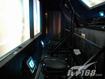 為了達(dá)到足夠大的尺寸,主屏幕采用SEAPRINE圖像控制器組成的1*2拼接,也就是采用了兩臺(tái)BARCO G5投影機(jī)來確保畫面的一流效果。不過由于投影距離的限制,這個(gè)方案里采用了二次反射系統(tǒng)。這也是這套方案的一個(gè)要點(diǎn)和關(guān)鍵。因?yàn)楹芏喙こ處熇靡恍└怕蕘砉浪阋淮位蚨啻握凵淇梢钥s短的投影距離,但欠缺科學(xué)和嚴(yán)謹(jǐn)?shù)膽B(tài)度,因?yàn)檫@個(gè)數(shù)據(jù)與屏幕安裝高度、投影方式(離軸或偏軸)、投影機(jī)體積、反射鏡面積等息息相關(guān)。