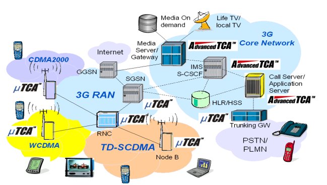 3G網絡中占主要地位的三個無線接入標準是WCDMA、TD-SCDMA與CDMA2000。3GPP與業(yè)界廠商對網絡結構的標準化做出的杰出努力,為在世界范圍內成功布署3G網絡業(yè)務起到了至關重要的作用。不過,3G網絡是復雜的系統,包含有多種多樣的網元設備,AdvancedTCA與MicroTCA技術的出現把它的實現方式引向了標準化的道路,即通過商用組件快速、低成本地布署3G網絡,減少了各種獨立的實現方式的復雜性,提高了互操作性。