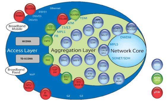 在匯聚層與核心網,對高可用性、傳輸容量與事務處理能力要求很高。ATCA通常是高性能的最佳選擇。mTCA與ATCA可對電信網中要求的操作性與高可用性提供與生俱來的支撐,而其它IT技術卻做不到。ATCA與mTCA作為一種系統技術,是電信級業(yè)務與商用組件之間自然而然的選擇。