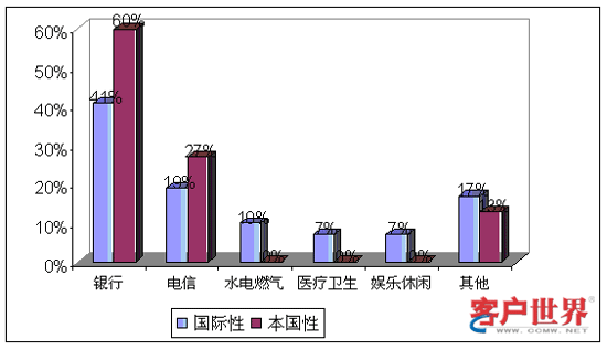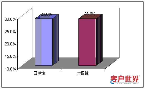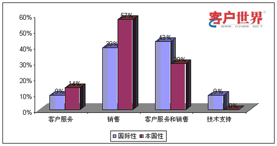 從業(yè)務(wù)功能看來,國際性呼叫中心和本國性呼叫中心承擔著不同的角色。9%的國際性呼叫中心和14%的本國性呼叫中心提供僅限于客戶服務(wù),例如賬號查詢和催費收款。39%的國際性呼叫中心和59%的本國性呼叫中心專門展開網(wǎng)上營銷和銷售(外撥為主)。43%的國際性呼叫中心和29%的本國性呼叫中心同時承擔客戶服務(wù)和銷售功能。最后,我們調(diào)查到9%的國際性呼叫中心專門從事技術(shù)支持,而且這些中心專門為國際市場設(shè)立。服務(wù)功能上的差異會對商業(yè)定位和人力資源管理提出不同的要求。