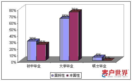 總的而言,參加調(diào)研的呼叫中心雇用的員工接受了平均15年的正式教育,也就是大學畢業(yè)的一般水平。國際性和本地型呼叫中心在勞動力的受教育水平上沒有呈現(xiàn)明顯差異。其中,30%的國際性和25%的本國性呼叫中心大量雇用初中畢業(yè)程度(12年教育)的員工;65%的國際性和75%的本國性呼叫中心雇用高中畢業(yè)程度(15年教育)的員工;此外,5%的國際性呼叫中心,往往是提供技術(shù)支持服務(wù),主要雇用碩士畢業(yè)水平(17年教育)的員工。