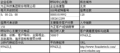 方正呼叫中心是方正服務(wù)平臺(tái)的重要組成部分,1999年建立,秉承了北大方正“勤備、嚴(yán)謹(jǐn)、求實(shí)、創(chuàng)新”的精神,依托方正科技“誠(chéng)信、創(chuàng)新、客戶(hù)導(dǎo)向、全局觀念、主動(dòng)高效、追求目標(biāo)和賞罰分明”的核心價(jià)值觀,以及“全程服務(wù)”的品牌文化,以“優(yōu)化服務(wù)流程,提高服務(wù)質(zhì)量,培育優(yōu)秀品牌,形成競(jìng)爭(zhēng)優(yōu)勢(shì),創(chuàng)新服務(wù)模式,加速業(yè)務(wù)增長(zhǎng)”作為自己的發(fā)展目標(biāo)和方向,并學(xué)習(xí)業(yè)界先進(jìn)的理念和方法,不斷探索和發(fā)展,多次受到媒體和機(jī)構(gòu)的關(guān)注。