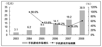 國內(nèi)手機游戲市場在過去的幾年里呈現(xiàn)快速發(fā)展的趨勢。2004年增長率接近100%,2005年也有50%以上的增長。但最近兩年國內(nèi)整個手機游戲市場隨著手機普及率的增速放緩也進(jìn)入了盤整期。iResearch咨詢估計,從2005年至2007年,國內(nèi)手機游戲市場的收入規(guī)模盡管仍然處于上漲趨勢,但年增長率逐年下降,2008年后隨著市場環(huán)境更加成熟理性,年增長率將會出現(xiàn)反彈,升至60%以上。