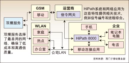 固定/移動網(wǎng)絡(luò)融合(FMC)概念已經(jīng)被炒作了兩年之久,其支持者一直都宣稱該技術(shù)可以將手機和基于室內(nèi)WLAN的無線電話相結(jié)合。今天,供應(yīng)商終于開始部署以特定交換局應(yīng)用為基礎(chǔ)的產(chǎn)品,以及面向手機的客戶端軟件。西門子移動事業(yè)部正在推出針對統(tǒng)一語音網(wǎng)絡(luò)的Hipath MobileConnect產(chǎn)品,而與此同時,新興企業(yè)Divitas網(wǎng)絡(luò)公司也聲稱,其基礎(chǔ)設(shè)施可以充當“移動/移動融合”的角色。