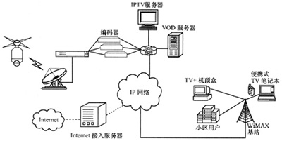 。。WiMAX網(wǎng)絡支持豐富多彩的業(yè)務模式。不同速率的數(shù)據(jù)業(yè)務是網(wǎng)絡的主要承載目標。WiMAX支持不同的QoS級別,因此網(wǎng)絡覆蓋范圍與業(yè)務類型緊密相關(guān)。在IPTV的接入方面,由于IPTV需要高級別的QoS保證以及高速的數(shù)據(jù)傳輸速率,所以根據(jù)小區(qū)內(nèi)用戶的數(shù)量以及需求,合理設置WiMAX網(wǎng)絡。用戶接入IPTV網(wǎng)絡的時候。不需要再次進行布線,只需加裝WiMAX接收設備和IP機頂盒即可,因此用戶可以方便、快捷地使用IPTV業(yè)務。WiMAX實現(xiàn)IPTV的接入如圖1所示。