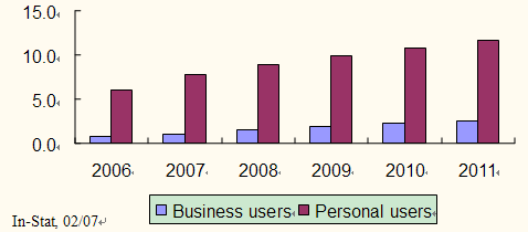 In-Stat預(yù)計,到2011年中國手機電子郵件用戶達(dá)到1400萬戶,其中企業(yè)用戶達(dá)到250萬,個人用戶達(dá)到1170萬。2007到2011年,企業(yè)用戶年均復(fù)合增長率為24.8%,個人用戶年均復(fù)合增長率為10.6%。如下圖所示: