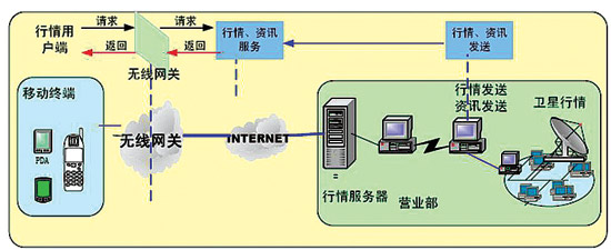 用戶借助無線終端通過無線接入網(wǎng)關(guān)登錄到移動證券業(yè)務(wù)平臺,移動證券業(yè)務(wù)平臺根據(jù)無線終端的請求類別提供實(shí)時(shí)的證券服務(wù)。