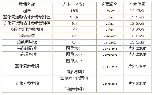 經(jīng)過(guò)優(yōu)化的程序和常用的數(shù)據(jù)結(jié)構(gòu)的大小可以放在L2中。所以按照上面的分析將L2配置為256KBSRAM,將程序代碼段(.text)、變量初值表(.cint)、常量字符串(.const)、全局變量靜態(tài)變量(.bss/.far)、堆棧段(.stack)等放入L2SRAM當(dāng)中,全局堆(.sysmem用于動(dòng)態(tài)存儲(chǔ)器分配)置于外部存儲(chǔ)器。表1總結(jié)了編碼器所要用到的存儲(chǔ)空間分配情況。