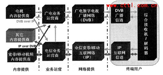 DVB技術通過廣電業(yè)務運營商來開展IPTV業(yè)務。由于廣電的業(yè)務通道是單向的,需要找到一條回路才能開展IPTV業(yè)務。這條回路既可以借助電信的業(yè)務通道來實現(xiàn),也可以再重新鋪設一條回路(盡管再重新鋪設一條回路會由于從技術和經(jīng)費上都需要巨大投入而使雙向改造實現(xiàn)起來十分困難,并且這種改造的投入和產(chǎn)出之間可能會產(chǎn)生相當大的差距,雖然可行性不大,但這畢竟是一種可以實現(xiàn)的解決方案)。