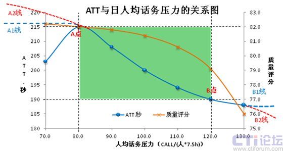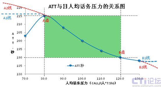 所以,在其它影響因素穩(wěn)定的情況下,當(dāng)人均話(huà)務(wù)壓力小于80或大于120的時(shí)候,ATT應(yīng)該保持在這兩個(gè)壓力點(diǎn)對(duì)應(yīng)的時(shí)長(zhǎng)附近(即190~215秒,如A1和B1線(xiàn)走勢(shì))我們暫且認(rèn)為這是合理的波動(dòng)范圍;若出現(xiàn)A2線(xiàn)走勢(shì),浪費(fèi)的必然是人員效率;若出現(xiàn)B2線(xiàn)走勢(shì),犧牲的必然是服務(wù)質(zhì)量。