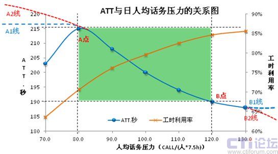 4、AB點(diǎn)間對(duì)應(yīng)的工時(shí)利用率范圍是70~85%,COPC高績(jī)效標(biāo)準(zhǔn)范圍74~88%(不同行業(yè)性質(zhì)的呼叫中心有所不同)。當(dāng)ATT大于215秒時(shí),平均工時(shí)利用率低于70%,是企業(yè)不能接受的人力浪費(fèi),這是典型的人浮于事的現(xiàn)象,運(yùn)營(yíng)者應(yīng)該想法提高人員利用率,如進(jìn)行專(zhuān)題培訓(xùn),開(kāi)展增值服務(wù),主動(dòng)向客戶(hù)攬活。當(dāng)ATT小于190秒時(shí),工時(shí)利用率向85%逼近,運(yùn)營(yíng)者應(yīng)該考慮分流話(huà)務(wù),增加人力。