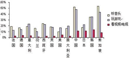 除打電話、發(fā)短信、拍照、手機郵箱以外,音樂、游戲也是用戶每周使用較多的業(yè)務。當被問及其它應用時,來自中國、新加坡還有韓國的部分被調查者表示,他們會經常用手機來聽音樂和玩游戲。其中,中國是惟一一個選擇用手機聽音樂的用戶數與選擇用手機拍照的用戶數旗鼓相當的國家。但有趣的是,手機在中國不太可能成為MP3的替代品,仍然只是一個便攜播放器。在新加坡,手機替代MP3的可能性就大多了。Ovum認為,這是由于高端手機在新加坡市場占有很高的比例。在歐洲和美國,使用手機來聽音樂和玩游戲的比例則比亞洲少了很多,但值得鼓勵的是仍有超過10%的被調查者選擇了該答案。(見圖2)