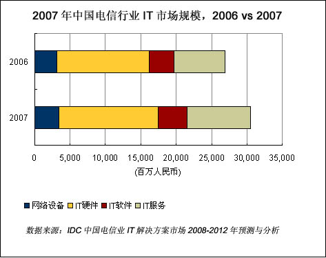 IDC《中國電信行業(yè)IT解決方案市場(chǎng)2008-2012年預(yù)測(cè)與分析》報(bào)告的數(shù)據(jù)顯示,2007年中國電信行業(yè)整體IT支出規(guī)模為305.02億元人民幣,比2006年增長了13.2%。2007年電信行業(yè)IT運(yùn)營支撐系統(tǒng)和增值業(yè)務(wù)系統(tǒng)的高速增長主要是由于運(yùn)營商都在為3G的實(shí)施和全業(yè)務(wù)運(yùn)營做準(zhǔn)備。