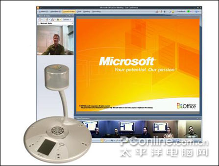 微軟Office RoundTable,音頻-視頻協(xié)作設(shè)備,帶有一個(gè)獨(dú)特的 360 度相機(jī)。在結(jié)合 Office Communications Server 2007 使用時(shí),RoundTable 還可交付卓越的會(huì)議體驗(yàn):將會(huì)議環(huán)境擴(kuò)展到多個(gè)位置,F(xiàn)場(chǎng)及遠(yuǎn)程位置的與會(huì)人員可以全景查看會(huì)議室中的每位成員,還可以在輪流發(fā)言時(shí)拉近特寫某個(gè)與會(huì)者。