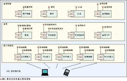 在圖1的網(wǎng)絡(luò)層次中,存在4種服務(wù)商角色:接入網(wǎng)提供商、業(yè)務(wù)網(wǎng)運營商、業(yè)務(wù)提供商、聚合門戶網(wǎng)站。業(yè)務(wù)網(wǎng)運營商可以在用戶簽約時提供多個業(yè)務(wù)提供者、聚合門戶網(wǎng)站的簽約選項,用戶可以選擇在成為業(yè)務(wù)網(wǎng)運營商的客戶的同時也成為多個感興趣的業(yè)務(wù)提供商的會員,后兩者可以訪問業(yè)務(wù)網(wǎng)運營商的認證、授權(quán)和計費(AAA)基礎(chǔ)設(shè)施,從而對用戶身份進行統(tǒng)一的認證、授權(quán)和計費。業(yè)務(wù)提供商和業(yè)務(wù)網(wǎng)運營商之間的劃分可以采用結(jié)算制也可以采用批發(fā)業(yè)務(wù)的方式。