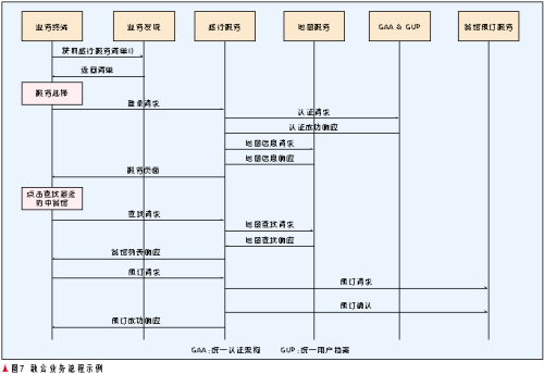 首先王先生的PDA通過歸屬網(wǎng)絡(luò)的業(yè)務(wù)發(fā)現(xiàn)服務(wù)器獲得旅行服務(wù)的主頁列表,他選擇一家訪問其旅行服務(wù),旅行服務(wù)通過其歸屬網(wǎng)絡(luò)的GAA&GUP對該終端進行認證以及提供旅行服務(wù)的授權(quán),成功后,旅行服務(wù)向地圖服務(wù)請求地圖信息并隨服務(wù)頁面一齊返回給終端,王先生點擊查找“離我最近的中餐館”按鈕,旅行服務(wù)將請求代理轉(zhuǎn)發(fā)給地圖服務(wù),后者返回中餐館列表(用戶的位置信息可以由用戶上報,或者由旅行服務(wù)查詢用戶歸屬網(wǎng)絡(luò)的位置服務(wù)獲得),旅行服務(wù)轉(zhuǎn)發(fā)給終端,當(dāng)王先生選擇一個中餐館并預(yù)訂時,旅行服務(wù)調(diào)用該餐館的預(yù)訂服務(wù),訂單傳給相應(yīng)服務(wù)人員,流程完成。