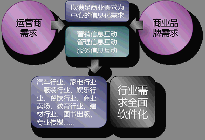 基于這個(gè)需求,那么運(yùn)營(yíng)商更需要的是針對(duì)行業(yè)版的解決方案,有許多的行業(yè)正在期待獲得這樣的商業(yè)信息化平臺(tái),包括:汽車行業(yè)、家電行業(yè)、服裝行業(yè)、娛樂行業(yè)、餐飲行業(yè)、商業(yè)賣場(chǎng)、教育行業(yè)、建材行業(yè)、圖書出版、專業(yè)傳媒等。