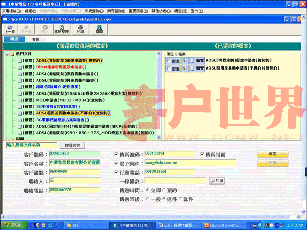 EFE第一步先將所有的窗口、文件與數(shù)據(jù)轉(zhuǎn)為電子化的檔案,當(dāng)需要傳送書(shū)面文件給客戶時(shí),客服人員可立即在在線點(diǎn)選以傳真或電子郵件將文件傳給客戶(如圖二),傳送成功后并立即以SMS通知客戶。當(dāng)客戶反饋數(shù)據(jù)回來(lái)時(shí),EFE會(huì)自動(dòng)接收并存盤,接收成功后EFE則會(huì)立即發(fā)送SMS訊息給客戶安心,而且所有送出與接收文件都有完整記錄可共管理、追蹤與處理。