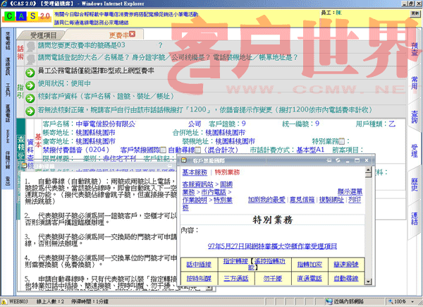 我們推動(dòng)「CPEP客服流程提升計(jì)劃」的重點(diǎn)是在IVR流程中就請(qǐng)客戶自行輸入其欲查詢或辦理的電話號(hào)碼,同時(shí)客服系統(tǒng)便先透過(guò)EAI到后端信息系統(tǒng),查詢出該號(hào)碼的核心數(shù)據(jù)(含基本、帳務(wù)、欠費(fèi)記錄、來(lái)電歷史等),當(dāng)客服人員應(yīng)答時(shí)客服系統(tǒng)便立即將這些核心數(shù)據(jù)顯示在屏幕上(如圖一),客服人員便可立即掌握此客戶之相關(guān)資料,CPEP如此改善后平均的服務(wù)效率提升了11%。