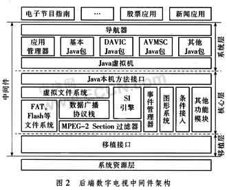 為了支持交互電視的發(fā)展,國(guó)際上許多組織制訂了相關(guān)的中間件標(biāo)準(zhǔn),比如歐洲D(zhuǎn)VB提出的MHP,美國(guó)針對(duì)有線電視系統(tǒng)由Cablelabs提出的OCAP,美國(guó)ATSC提出的DASE等,其中MHP標(biāo)準(zhǔn)應(yīng)用最為廣泛。圖2提出的中間件架構(gòu)符合國(guó)家數(shù)字電視中間件標(biāo)準(zhǔn)(草案),以JavaTM語(yǔ)言為基礎(chǔ),在MHP基礎(chǔ)上去除了MHP包中的冗余部分。