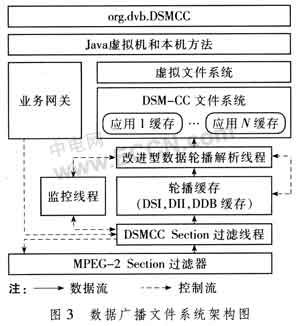中間件的數(shù)據(jù)廣播文件系統(tǒng)主要負(fù)責(zé)裝載廣播應(yīng)用,是數(shù)據(jù)輪播協(xié)議在終端實(shí)現(xiàn)的核心模塊。圖3給出了基于改進(jìn)型數(shù)據(jù)輪播方案的數(shù)據(jù)廣播文件系統(tǒng)的架構(gòu)圖。相關(guān)Java功能在org.dvb.DSMCC包實(shí)現(xiàn),對(duì)應(yīng)中間件架構(gòu)的系統(tǒng)層部分。具體的功能實(shí)現(xiàn)位于核心層。