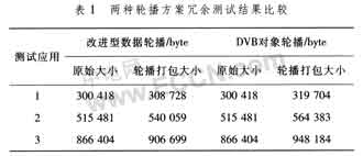 表l比較了改進(jìn)型數(shù)據(jù)輪播和DVB對(duì)象輪播方案打包前后的數(shù)據(jù)。由表1可知,改進(jìn)型數(shù)據(jù)輪播引入的帶寬冗余信息要小于對(duì)象輪播,可為平臺(tái)節(jié)省更多的帶寬資源。