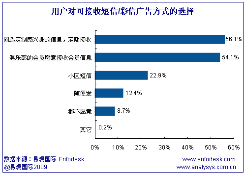從用戶對短信廣告的接受程度來看,用戶對于自己感興趣領域的短信廣告并不反感,甚至樂于接受或定制。根據易觀國際Enfodesk發(fā)布的用戶調研數據,56.1%的用戶愿意定制自己感興趣的信息,54.1%的用戶愿意接受會員信息,只有8.7%的用戶不愿意接受任何形式的短信/彩信廣告。但是這類用戶樂于接受的短信廣告反而一般有固定的端口號,更容易被攔截,因此易觀國際(Analysys International)認為,該短信過濾業(yè)務更加傾向于攔截對用戶相對更有價值的信息,造成垃圾信息“驅逐”有價值信息的結果,不利于短信廣告行業(yè)的健康發(fā)展。
