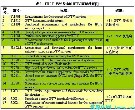 GSI活動中來。到目前ITU-T已經(jīng)完成了17項IPTV相關(guān)標(biāo)準(zhǔn)。在標(biāo)準(zhǔn)制定過程中,一方面各地區(qū)組織積極將成果以提案的形式提交ITU-T,另一方面,ITU-T也及時與各組織溝通最新進展,協(xié)調(diào)標(biāo)準(zhǔn)制定的差異。在ITU-T需求和架構(gòu)等標(biāo)準(zhǔn)發(fā)布后,ETSI、ATIS等組織都積極引用和參考。ITU-T在引領(lǐng)全球IPTV標(biāo)準(zhǔn)研究,協(xié)調(diào)各國家和地區(qū)標(biāo)準(zhǔn)化活動中發(fā)揮了重要作用。