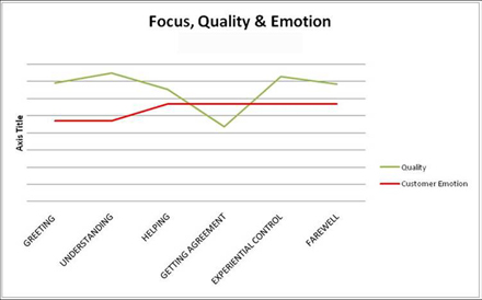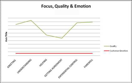第二張圖片中客戶在很生氣的狀態(tài)下開始呼叫,而代理除了幫助階段外表現得都很好。該代理執(zhí)行的是最低績效標準,但他對客戶的影響卻等于零。分析師提出了一個非常明顯而重要的關節(jié)——幫助是整個呼叫中最為重要的環(huán)節(jié)。這就是我們要做的事情。如果在幫助這一環(huán)上沒做好,那么其它環(huán)節(jié)如感謝客戶、問候客戶等等都變得無足輕重。