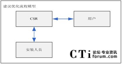 對(duì)于客服中心來(lái)講,當(dāng)受理了用戶(hù)的需求時(shí),CSR與用戶(hù)便成了服務(wù)流程中的關(guān)鍵角色,安裝人員只是CSR的一個(gè)協(xié)作角色(內(nèi)部流程下游角色)。如果在為用戶(hù)提供服務(wù)過(guò)程中,將安裝人員“引入”流程中,無(wú)疑將影響流程的執(zhí)行效果。另外,讓用戶(hù)代替CSR去聯(lián)系“安裝人員”這更加影響用戶(hù)的感受。