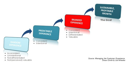 目前多數(shù)電信企業(yè)提供的都是‘隨機’體驗。隨機體驗是各種不連續(xù)端到端體驗的集合體。它發(fā)生在整體客戶體驗未得到恰當(dāng)管理或企業(yè)漠視客戶與員工的情況下。最終這將導(dǎo)致品牌走向墮落以及丟失有價值的客戶、利潤和企業(yè)價值。如果企業(yè)不想如上所述這樣慘淡收場,那么他們至少要做到創(chuàng)造和交付一種可預(yù)測的體驗——連續(xù)且有意向的(見圖1)。