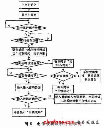 如圖2所示,電子鎖原始密碼和用戶設(shè)定密碼已存于外部存儲(chǔ)器E2PROM內(nèi),用戶要開(kāi)門(mén)需先用電子感應(yīng)鑰匙開(kāi)RFID碼感應(yīng)鎖,當(dāng)感應(yīng)鎖成功開(kāi)鎖時(shí),系統(tǒng)將發(fā)出語(yǔ)音提示“感應(yīng)鎖開(kāi)鎖成功”,然后輸入先前設(shè)定的密碼,密碼正確后,系統(tǒng)發(fā)出語(yǔ)音提示“開(kāi)鎖成功”,否則提示“輸入密碼錯(cuò)誤”。輸入密碼三次以上錯(cuò)誤,系統(tǒng)將報(bào)警并自鎖30 min。整個(gè)開(kāi)鎖時(shí)間不能超過(guò)30 s,否則系統(tǒng)發(fā)出警報(bào)聲,以防止盜賊在短時(shí)間內(nèi)利用萬(wàn)能工具開(kāi)鎖。系統(tǒng)待機(jī)時(shí)能在液晶上顯示時(shí)間、日期和星期等信息,實(shí)現(xiàn)友好的人機(jī)界面。