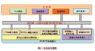 為了適應全業(yè)務競爭的需要,長遠規(guī)劃業(yè)務支撐系統(tǒng),移動采用SOA(Service Oriented architecture,面向服務的架構(gòu))技術(shù)對業(yè)務支撐系統(tǒng)進行了改造,并把鐵通資源融合進SOA架構(gòu),改造項目以業(yè)務支撐系統(tǒng)SOA架構(gòu)為基礎(chǔ),進行寬帶業(yè)務合營和IPPBX固話業(yè)務合營,構(gòu)建基于SOA架構(gòu)的一體化服務營銷支撐體系。