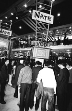 韓國移動(dòng)通信運(yùn)營商SK電訊的展臺(tái)是整個(gè)展會(huì)上最熱鬧的地方之一,能歌善舞的韓國藝人吸引了很多觀眾駐足。在“為人類的移動(dòng)互聯(lián)通信, SK電訊與您攜手”的主題下,SK電訊展示了移動(dòng)增值及移動(dòng)互聯(lián)服務(wù)。
