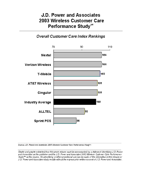 Nextel和Verizon移動(dòng)在全部七家大型移動(dòng)服務(wù)提供商的客戶服務(wù)表現(xiàn)中并列前茅。Nextel在自動(dòng)應(yīng)答系統(tǒng)方面的表現(xiàn)特別好,尤其是指引/提示部分。Verizon移動(dòng)則是在所有各個(gè)方面都表現(xiàn)超過(guò)平均值,特別是讓客服代表理解客戶的問(wèn)題和比較短的打入客服中心后的電話等待時(shí)間方面。