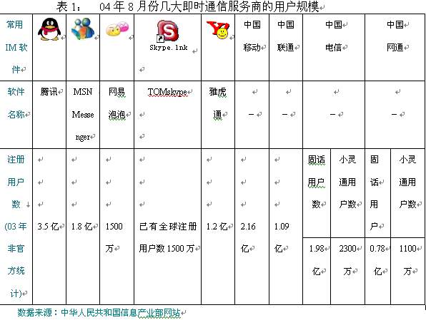 11月16日,TOM在線(xiàn)和歐洲行業(yè)巨頭Skype在京聯(lián)手推出聊天工具TOM-Skype,此業(yè)務(wù)的出現(xiàn),立即在即時(shí)通信市場(chǎng)上掀起了軒然大波。其清晰的話(huà)音質(zhì)量,簡(jiǎn)潔方便的操作界面,擁有來(lái)自165個(gè)國(guó)家1500多萬(wàn)的全球用戶(hù),在極短的時(shí)間內(nèi)就吸引到了大量的中國(guó)用戶(hù),更讓基礎(chǔ)運(yùn)營(yíng)商感到不安的是skype強(qiáng)大的語(yǔ)音聊天功能將可能大大改變傳統(tǒng)電信的使用習(xí)慣;而與此同時(shí),現(xiàn)有的QQ,POPO等國(guó)內(nèi)即時(shí)通信工具也早已開(kāi)展了語(yǔ)音聊天功能,只是苦于目前話(huà)音質(zhì)量不盡理想而已。面對(duì)眾多虛擬運(yùn)營(yíng)商現(xiàn)實(shí)和潛在威脅,幾大基礎(chǔ)運(yùn)營(yíng)商選擇先下手為強(qiáng),進(jìn)入“即時(shí)通信”市場(chǎng)的戰(zhàn)略也就不足為怪了。