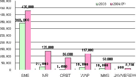 短信業(yè)務是各類移動增值業(yè)務中用戶量最多的新業(yè)務,2003年已達到1.4億,WAP、IVR和CRBT業(yè)務2004年都取得高速增長。其中WAP用戶規(guī)模達到2500萬,其市場規(guī)模由2003年的1.8億元增長為2004年的11.7億元。