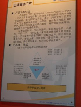 近日,中國電信在西安召開了上半年市場(chǎng)工作會(huì)議暨新產(chǎn)品展示專題研討會(huì),在此次會(huì)議上,各省電信公司分別展示了自己面向市場(chǎng)開發(fā)的新型業(yè)務(wù)。其中,來自浙江電信的一種叫企業(yè)通信門戶ECP(Enterprise Communications Portal)的主推業(yè)務(wù)在展示過程中吸引了眾多目光,引起了其他與會(huì)代表的關(guān)注,被認(rèn)為是中國電信拓展企業(yè)市場(chǎng)空間的最具潛力產(chǎn)品之一。