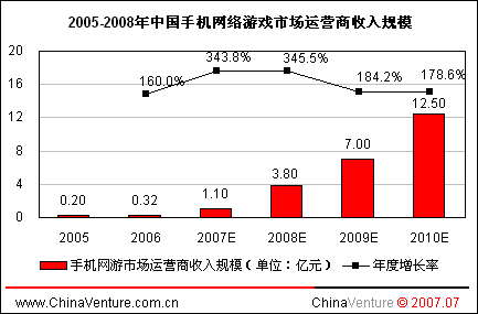 手機(jī)網(wǎng)游業(yè)務(wù)經(jīng)過(guò)近幾年培育,市場(chǎng)規(guī)模逐步擴(kuò)大。隨著用戶(hù)認(rèn)知度和普及率逐步提高,未來(lái)將成為游戲產(chǎn)業(yè)新的增長(zhǎng)點(diǎn)。代表手機(jī)游戲未來(lái)發(fā)展方向的手機(jī)網(wǎng)游市場(chǎng)必將在2008年和2009年開(kāi)始獲得風(fēng)險(xiǎn)投資商的廣泛關(guān)注。