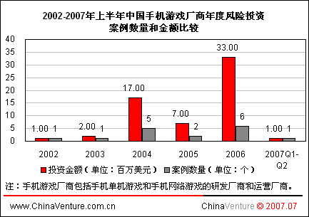 ChinaVenture分析師指出,除2006年觸通安騰和掌上明珠依靠手機(jī)網(wǎng)游業(yè)務(wù)獲得數(shù)百萬(wàn)美元投資外,其余企業(yè)獲融資原因均為投資商看好手機(jī)單機(jī)游戲業(yè)務(wù)。2007年之前由于手機(jī)網(wǎng)游市場(chǎng)規(guī)模過(guò)小,加上無(wú)線網(wǎng)絡(luò)環(huán)境制約,風(fēng)險(xiǎn)投資商大多抱以觀望態(tài)度。