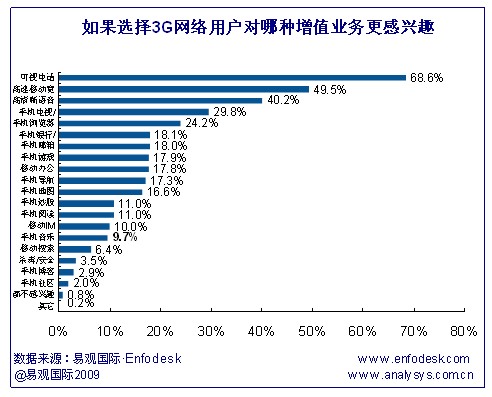 據(jù)易觀Enfodesk《中國3G市場用戶調(diào)研報告2009》研究發(fā)現(xiàn),可視電話成為最受用戶歡迎的增值業(yè)務,除此之外,高速移動寬帶業(yè)務和高清晰語音受用戶選擇比例也較高,分別達到49.5%和40.2%。與此相反的是,手機社區(qū)、手機博客和殺毒/安全業(yè)務受歡迎程度最小。