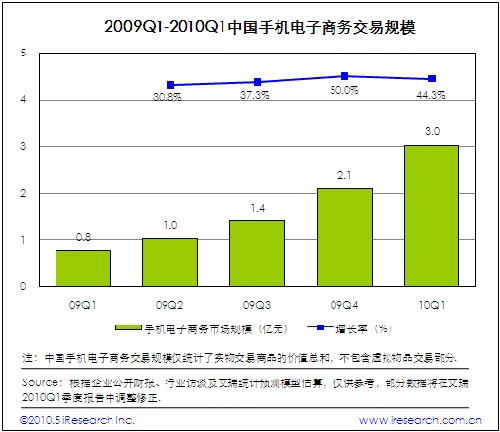 根據(jù)艾瑞咨詢即將發(fā)布的2010年第一季度中國移動(dòng)互聯(lián)網(wǎng)市場數(shù)據(jù)顯示,2010Q1中國移動(dòng)互聯(lián)網(wǎng)市場整體交易規(guī)模達(dá)到44.9億,環(huán)比增長5.2%。艾瑞咨詢分析認(rèn)為,盡管電信運(yùn)營商計(jì)費(fèi)政策調(diào)整,對(duì)移動(dòng)增值市場收入產(chǎn)生負(fù)面影響,但是手機(jī)電子商務(wù)、手機(jī)搜索等業(yè)務(wù)領(lǐng)域的良好市場表現(xiàn),推動(dòng)移動(dòng)互聯(lián)網(wǎng)市場規(guī)模平穩(wěn)增長。