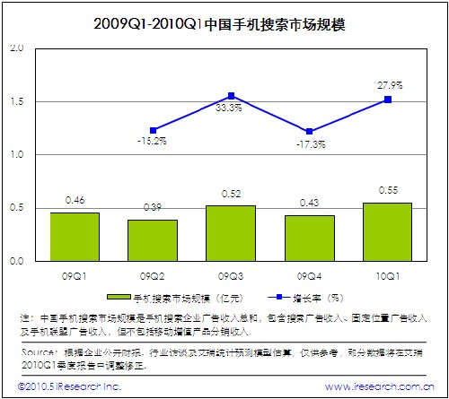 2010Q1中國手機(jī)搜索市場規(guī)模為5500萬,環(huán)比增長27.9%,手機(jī)搜索請(qǐng)求量和PV的大幅增長帶動(dòng)廣告收入增加。自2009年下半年以來,受手機(jī)上網(wǎng)用戶規(guī)模迅速發(fā)展以及用戶活躍度和黏性顯著增加的影響,手機(jī)搜索市場進(jìn)入快速發(fā)展階段。與此同時(shí),手機(jī)搜索企業(yè)紛紛加大市場投入力度,建立與電信運(yùn)營商和手機(jī)終端廠商的深度合作關(guān)系是業(yè)務(wù)拓展的重點(diǎn)方向。此外,網(wǎng)頁產(chǎn)品和客戶端軟件深度整合也是手機(jī)搜索企業(yè)布局移動(dòng)互聯(lián)網(wǎng)市場的最佳實(shí)踐。受谷歌事件影響,艾瑞預(yù)計(jì)2010Q2手機(jī)搜索市場集中度將進(jìn)一步提高。