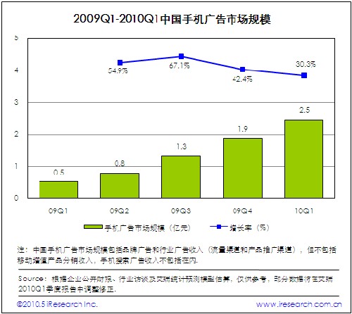 2010Q1中國手機(jī)廣告市場規(guī)模達(dá)到2.5億,環(huán)比增長30.3%.受季節(jié)性因素影響,手機(jī)廣告市場增速放緩,但是保持增長發(fā)展態(tài)勢(shì)。本季度,新聞、體育、數(shù)碼、女性和汽車類手機(jī)廣告市場表現(xiàn)良好,文本、橫幅、全屏以及客戶端軟件等手機(jī)廣告形式受到廣告主青睞。針對(duì)不同受眾群體進(jìn)行多重定向廣告營銷成為更多手機(jī)廣告服務(wù)提供商的實(shí)踐方向。盡管本季度手機(jī)廣告市場取得良好的市場表現(xiàn)力,但是廣告定價(jià)和廣告效果評(píng)估等制約手機(jī)廣告市場發(fā)展的關(guān)鍵因素仍將長期存在。
