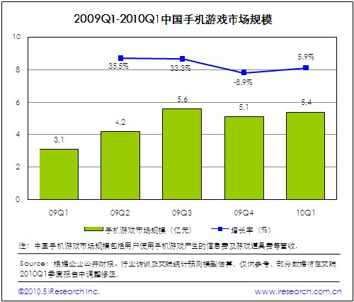 2010Q1中國手機(jī)游戲市場規(guī)模為5.4億,環(huán)比增長5.9%.2009年底電信運(yùn)營商調(diào)整業(yè)務(wù)合作伙伴計(jì)費(fèi)政策,導(dǎo)致WAP和G+手機(jī)游戲平臺(tái)等特定計(jì)費(fèi)平臺(tái)暫時(shí)停止計(jì)費(fèi),對(duì)手機(jī)游戲市場營收增長產(chǎn)生不利影響。除了季節(jié)因素以外,手機(jī)單機(jī)游戲受電信運(yùn)營商暫停WAP計(jì)費(fèi)影響較大,手機(jī)網(wǎng)游受政策影響有限。盡管本季度手機(jī)游戲市場扭轉(zhuǎn)營收規(guī)模下滑的不利局面,重新恢復(fù)增長態(tài)勢(shì),但是手機(jī)游戲?qū)﹄娦胚\(yùn)營商計(jì)費(fèi)通道的高依存度,決定行業(yè)受政策風(fēng)險(xiǎn)的影響較大。實(shí)現(xiàn)營收多元化是手機(jī)游戲業(yè)界思考和關(guān)注的問題。